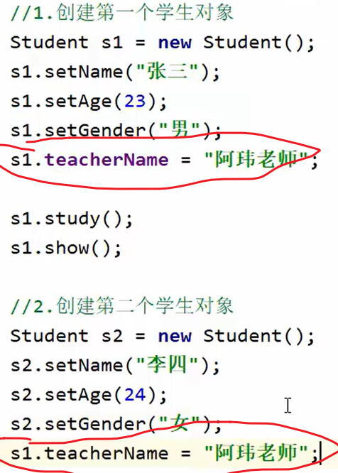 比如说创建了s1,s2两个学生对象,他们有共同的老师t,调用方法时老师是同一个